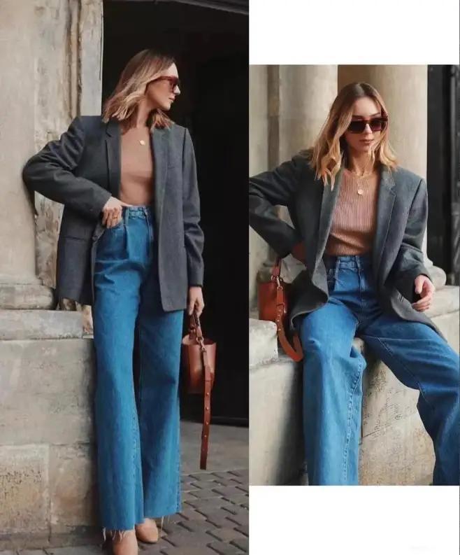 无下面用灰色的西装内搭针织衫和一条蓝色的牛仔直筒裤,脚上穿着一双皮质的单鞋,这样的打扮很适合高个子或者是骨架比较大的女性借鉴。