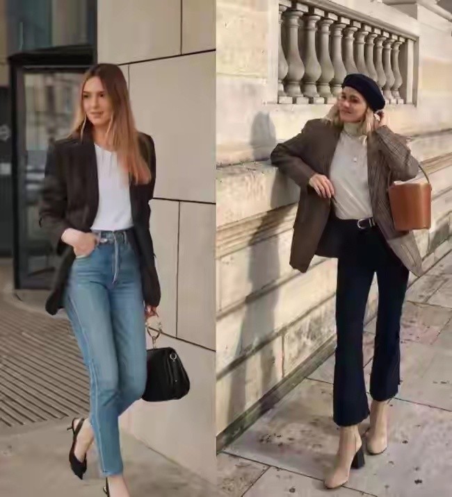 如下面用小香风外套或者是西装外套来搭配上牛仔裤,这样的穿衣打扮,清爽又洋气,而且很干练。