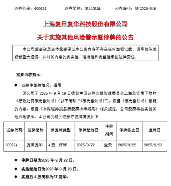 中国高校第一家上市公司复旦复华(600624)19日晚间公告,因收到中国证监会上海监管局《行政处罚事先告知书》(下称《告知书》),公司披露的年度报告财务指标存在虚假记载,根据上交所规定,公司股票9月22日停牌一天,自9月23日起被实施其他风险警示,A股简称变更为“ST复华”,日涨跌幅限制为5%。